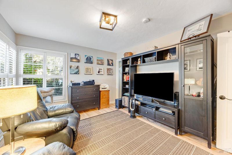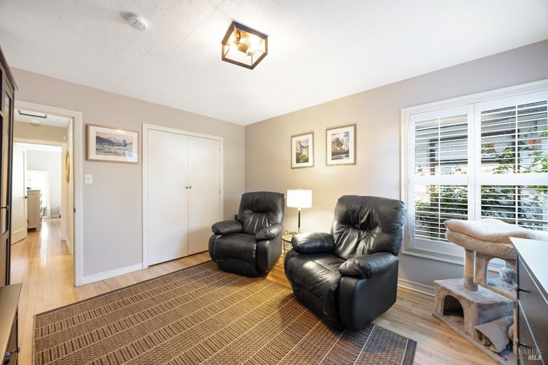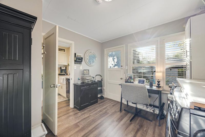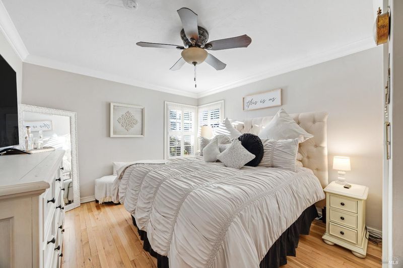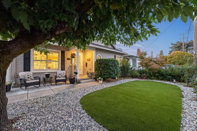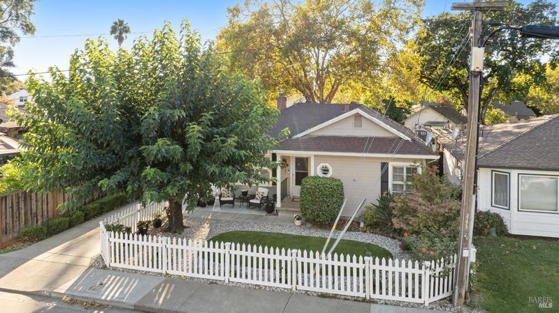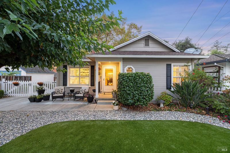 Adorable 2-bedroom, 1-bath one level home built in 1947 radiating warmth, charm, and character. Ideally located near Montgomery Village, Downtown Santa Rosa, Memorial Hospital neighborhoods, and sought out schools including local charter school. A white picket fence, manicured turf, large shade tree, and cozy front patio create an inviting first impression. An extra-long gated approx. 100-ft driveway leads to a detached 2-car garage. Inside, original hardwood floors, crown molding, shutters, and decorative accents highlight the vintage appeal. The living room features a fireplace (not in use) and flows into a dining area with a modern light fixture and remodeled kitchen with quartz counters, quality cabinetry with custom touches including a spice rack, luxury vinyl plank floor, glass accents, pull-out shelves & soft close, farmhouse sink, and updated appliances. The versatile multi-purpose room offers laundry, office, and storage space with backyard access. The updated bathroom features a new vanity, shiplap accent wall, tile floors & bath. Enjoy the inviting backyard retreat with a chic shed for hobbies or storage, a paver patio, lush lawn, twinkle lights, and a raised seating area perfect for relaxing or entertaining under the stars. Your home sweet home awaits you!