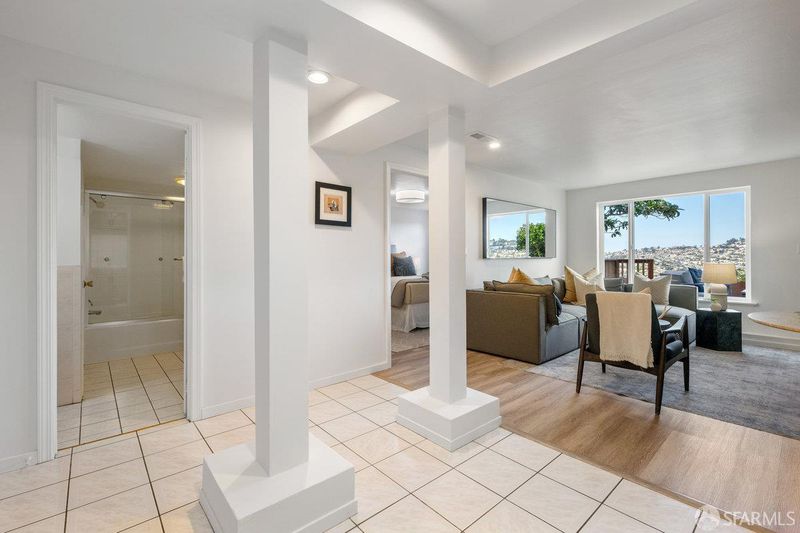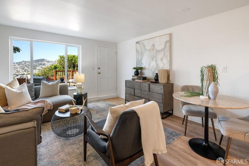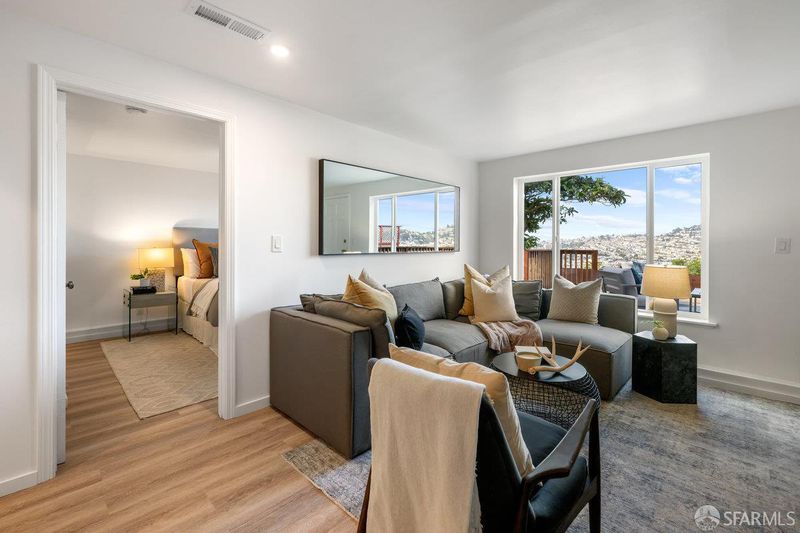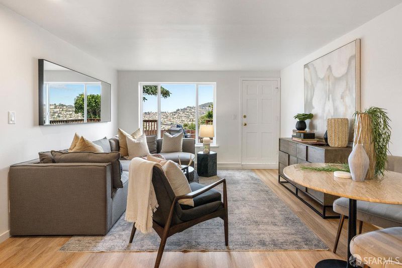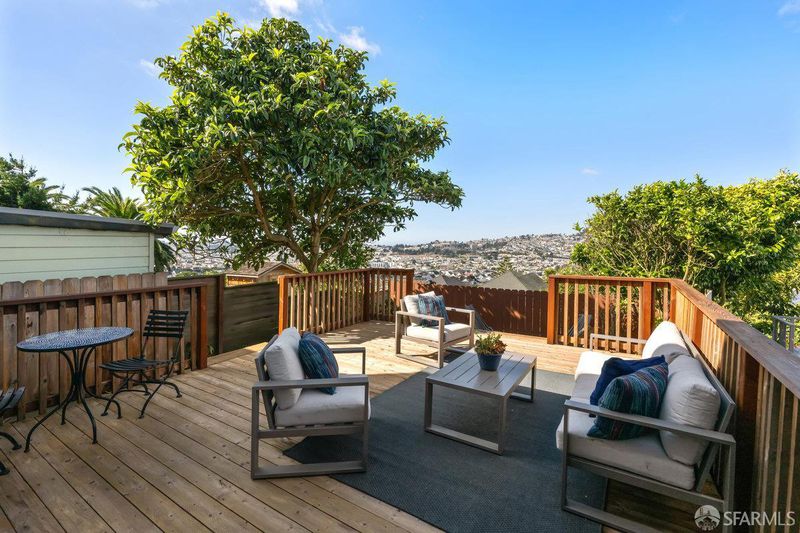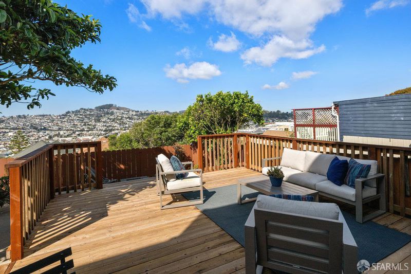 Dramatic western views captivate from this Excelsior home close to all MacLaren Park has to offer. Two bedrooms and one bath, a gracious open concept living space with corner fireplace and a large well appointed kitchen make up a lovely main floor. Downstairs, a bright family room opens to a large deck that captures dreamy SF sunsets over Twin Peaks and Sutro Tower. This floor also has a large bedroom and bath. Garage and plenty of storage. Double paned windows. Freshly painted and Ready for new owner! One block from the awesome Athens Avalon Open Space area.