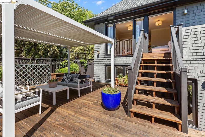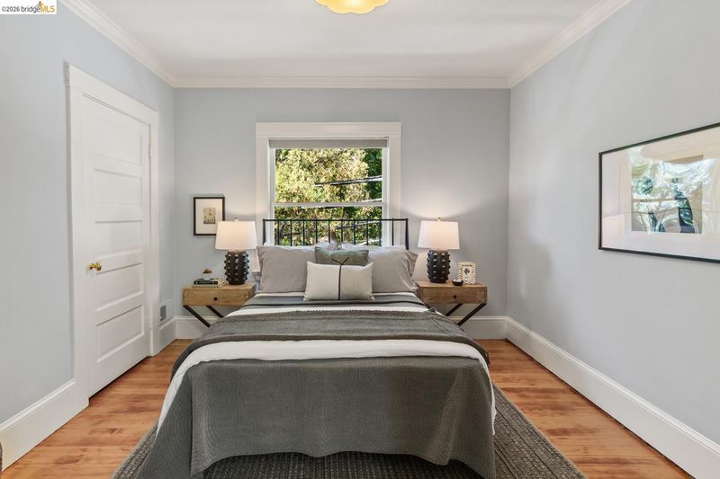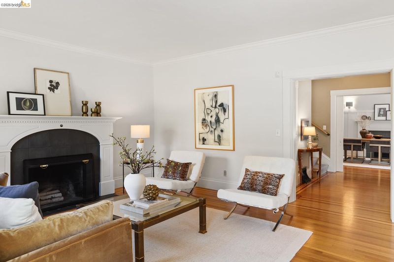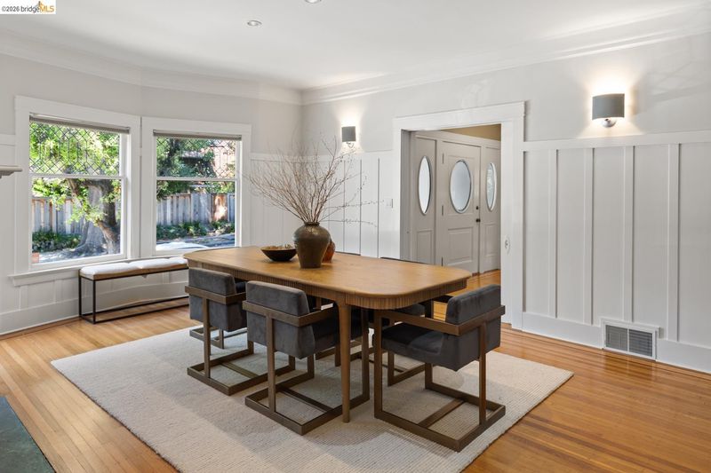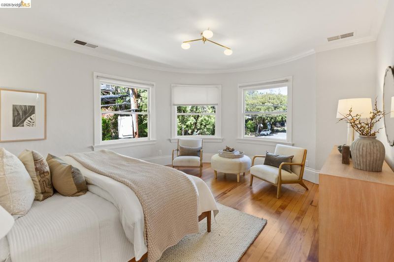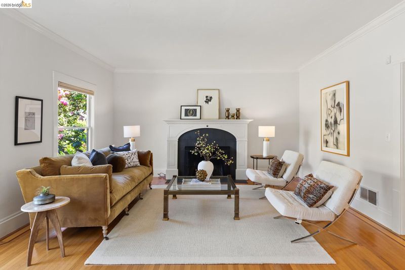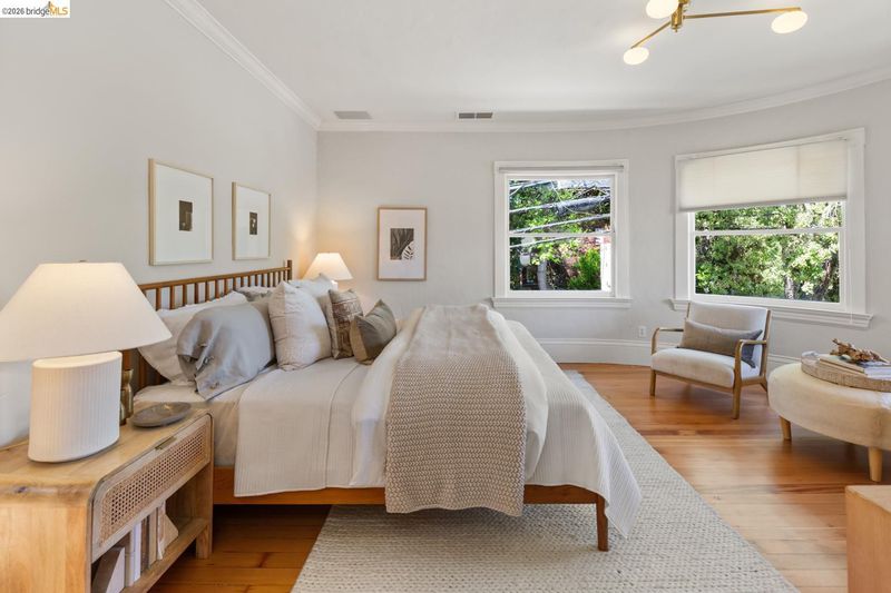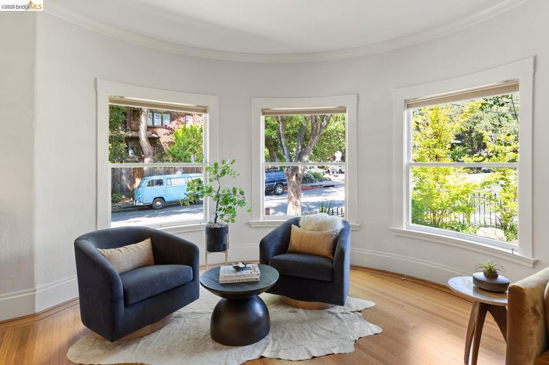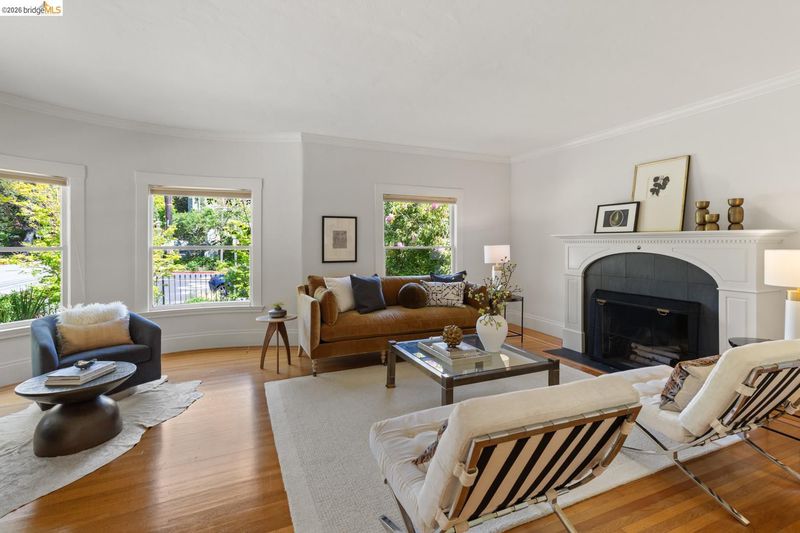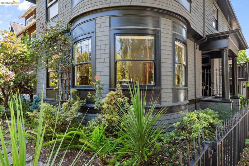 Stately and iconic, this historic 5+BR/4BA Elmwood Edwardian occupies a coveted corner lot just blocks from College Avenue. Distinguished by elegant, rounded windows that flood the home with natural light, the residence blends timeless architectural beauty with sophisticated modern updates. A dramatic entry opens to a grand foyer with coat closet and powder room, leading to a gracious living room with high ceilings, gleaming hardwood floors, fireplace, and beveled glass windows. A formal dining room with oversized windows and original pocket doors sets the stage for memorable entertaining. The beautifully remodeled chef’s kitchen features Carrara marble counters, premium appliances, double ovens, an extra-tall refrigerator, abundant storage, and a generous eat-in area. Upstairs, a luxurious primary suite offers a walk-in closet and spa-like bath with steam shower and skylights. Two additional bedrooms, 1.5 baths, and a conveniently located laundry complete the level. A spacious family room or office with floor-to-ceiling windows opens to a deck for seamless indoor-outdoor flow. The top floor offers a flexible guest/exercise space with skylights and Bay glimpses. A separate guest suite with full bath and private garden entry provides ideal accommodations. Surrounded by mature gardens and featuring extensive system upgrades, including newer foundation, electrical, and plumbing, this exceptional home offers timeless elegance in one of Berkeley’s most sought-after neighborhoods just moments to shops, dining, trails, and commute options. Elmwood living at its finest! BESO Score 2