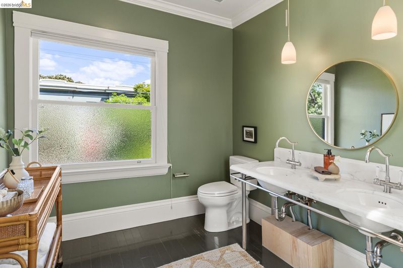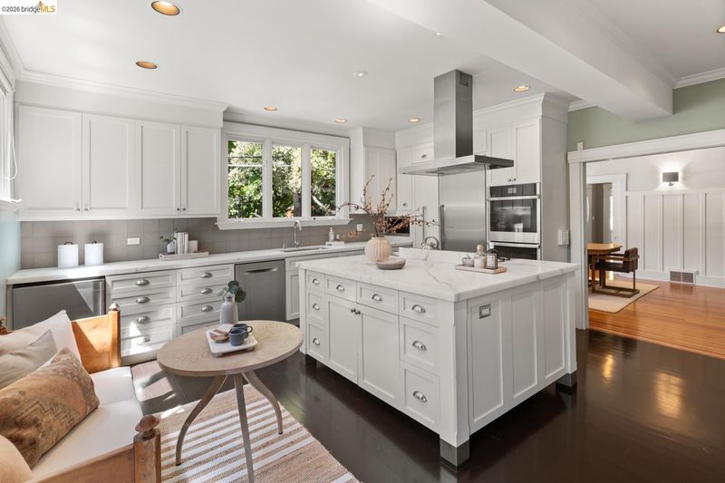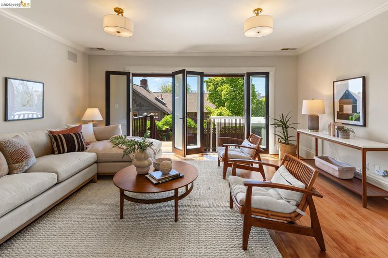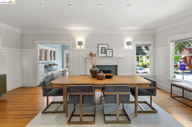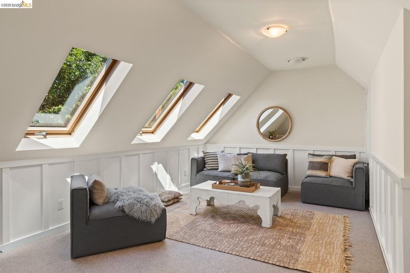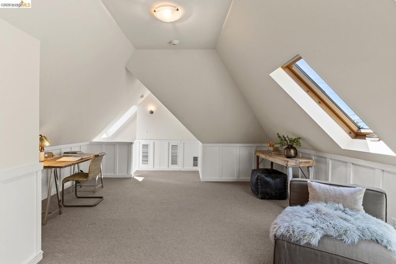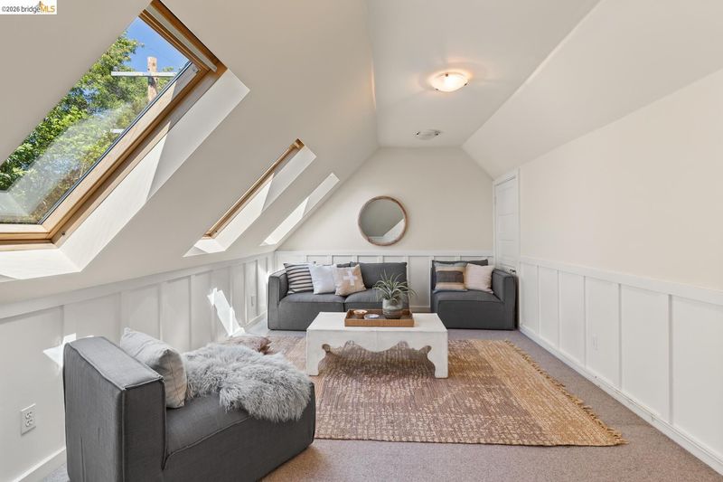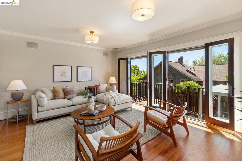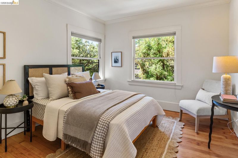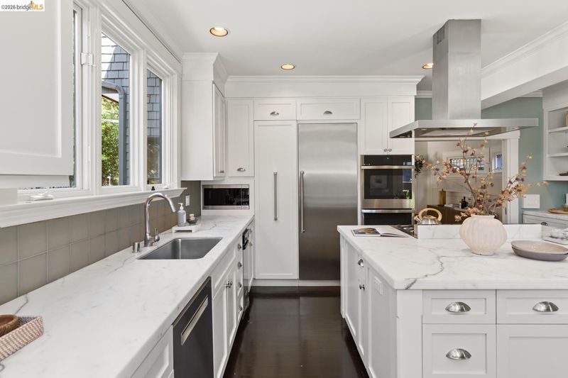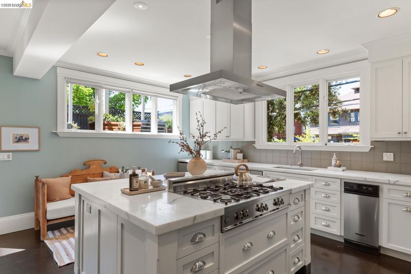 Stately and iconic, this historic 5+BR/4BA Elmwood Edwardian occupies a coveted corner lot just blocks from College Avenue. Distinguished by elegant, rounded windows that flood the home with natural light, the residence blends timeless architectural beauty with sophisticated modern updates. A dramatic entry opens to a grand foyer with coat closet and powder room, leading to a gracious living room with high ceilings, gleaming hardwood floors, fireplace, and beveled glass windows. A formal dining room with oversized windows and original pocket doors sets the stage for memorable entertaining. The beautifully remodeled chef’s kitchen features Carrara marble counters, premium appliances, double ovens, an extra-tall refrigerator, abundant storage, and a generous eat-in area. Upstairs, a luxurious primary suite offers a walk-in closet and spa-like bath with steam shower and skylights. Two additional bedrooms, 1.5 baths, and a conveniently located laundry complete the level. A spacious family room or office with floor-to-ceiling windows opens to a deck for seamless indoor-outdoor flow. The top floor offers a flexible guest/exercise space with skylights and Bay glimpses. A separate guest suite with full bath and private garden entry provides ideal accommodations. Surrounded by mature gardens and featuring extensive system upgrades, including newer foundation, electrical, and plumbing, this exceptional home offers timeless elegance in one of Berkeley’s most sought-after neighborhoods just moments to shops, dining, trails, and commute options. Elmwood living at its finest! BESO Score 2