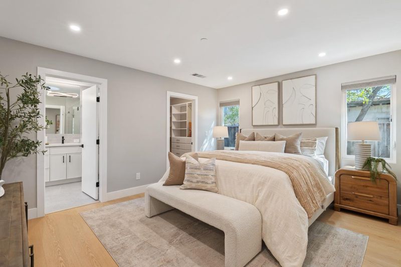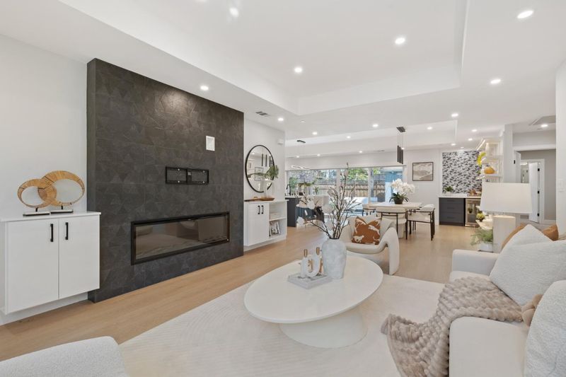 rebuilt from the foundation in 2024, this sleek contemporary home offers modern design and exceptional versatility with a fully independent detached ADU completed in 2022. Clean lines, a glass-panel garage door, and a striking blue entry set the tone for stylish interiors throughout. The main home features 3 bedrooms and 2 baths centered around an open-concept great room with a geometric tile fireplace, floating cabinetry, and seamless indoor-outdoor flow via sliding glass doors. The designer kitchen showcases navy and white cabinetry, marble-style quartz counters, stainless steel appliances, and a spacious island with seating. A formal dining area with open shelving and wine bar enhances functionality. The primary suite offers a custom walk-in closet and spa-like bath with freestanding tub, frameless shower, and dual vanities. Two additional bedrooms share a hall bath. An attached 1-car garage includes laundry. The detached 1-bedroom, 1-bath ADU (1948 Hackett Ave) features a full kitchen, living area, laundry, and mini-split HVAC ideal for guests or rental income. Low-maintenance synthetic lawns and landscape lighting complete the property. Ideally located one block from Rengstorff Park, near Castro Street and San Antonio Center, with access to top Mountain View schools.