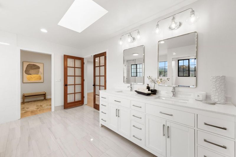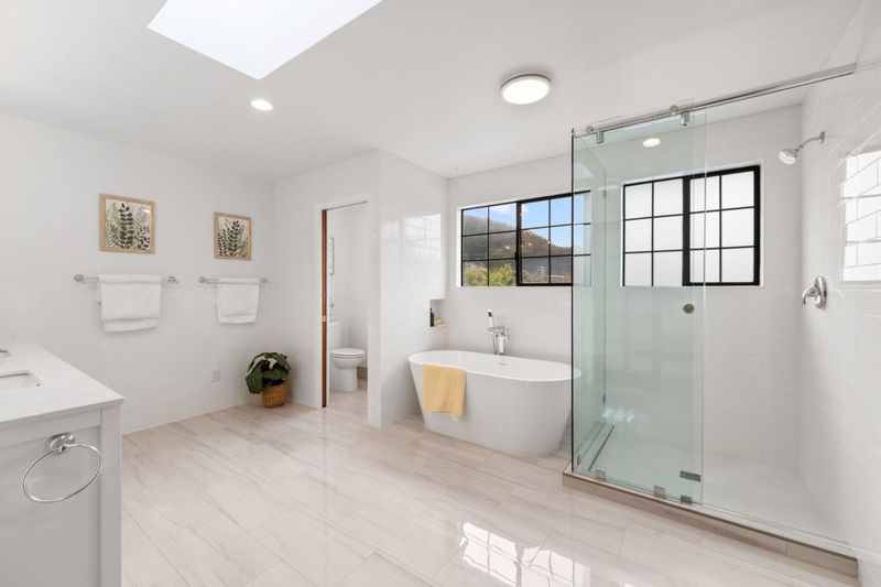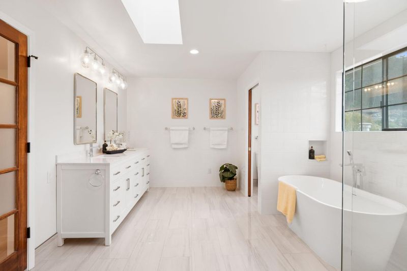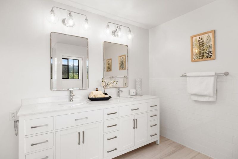 - Double Sinks, Full on Ground Floor, Primary - Oversized Tub, Primary - Stall Shower(s), Showers over Tubs - 2+, Stall Shower, Tile, Updated Bath