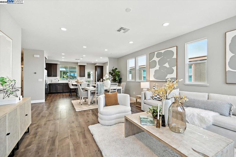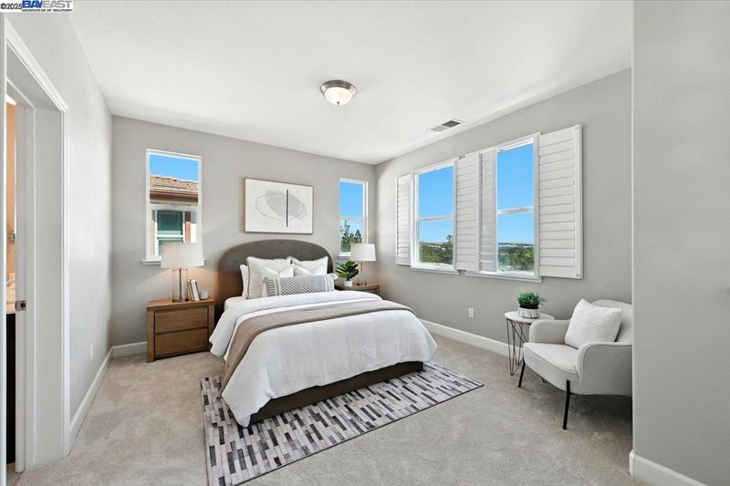 Welcome to 437 Ryan Terrace—an elegant tri-level corner townhome in the heart of San Ramon, a city celebrated for its top-rated schools, family-friendly vibe, and abundant parks. This spacious 3-bedroom + office, 3.5-bath residence blends comfort and functionality with designer finishes throughout. The gourmet kitchen boasts a large quartz island, gas cooktop, stainless steel appliances, and generous cabinetry. Enjoy luxury flooring in the main living areas, brand-new carpet in all bedrooms and hallways, and smart dual-zone climate control. Start your mornings on the private balcony, then retreat upstairs to a serene third level featuring a luxurious primary suite with dual vanities, a custom walk-in closet, and stunning mountain views. Two additional bedrooms share a full bath, while the laundry room offers custom built-ins. The versatile ground-level office (no closet) includes a full bath—ideal as a guest room, workspace, or media lounge. Additional highlights include a tankless water heater, EV charging outlet, and a 2-car side-by-side garage. All this in a quiet, kid-friendly community with easy access to I-680, shopping, and top schools—don’t miss this exceptional opportunity!