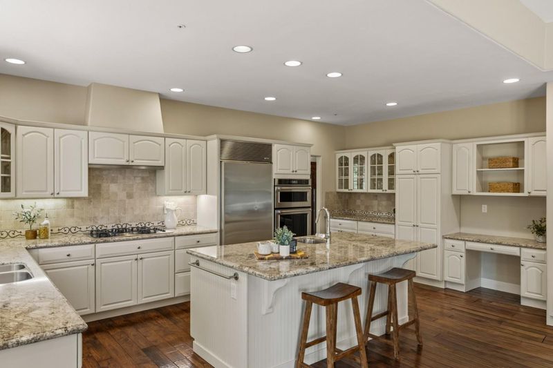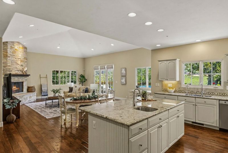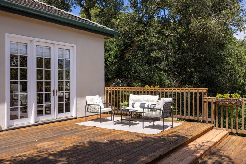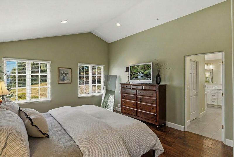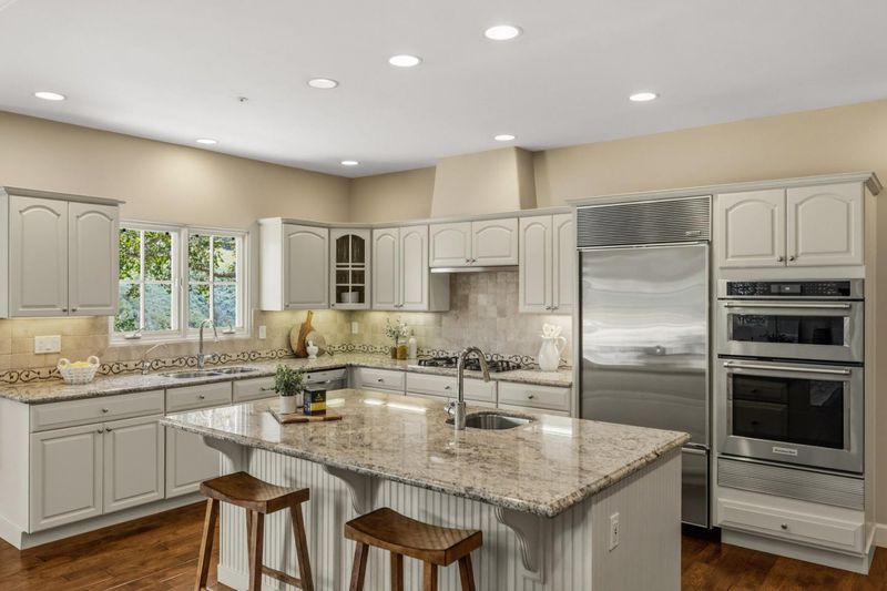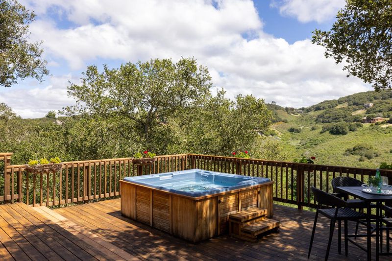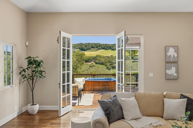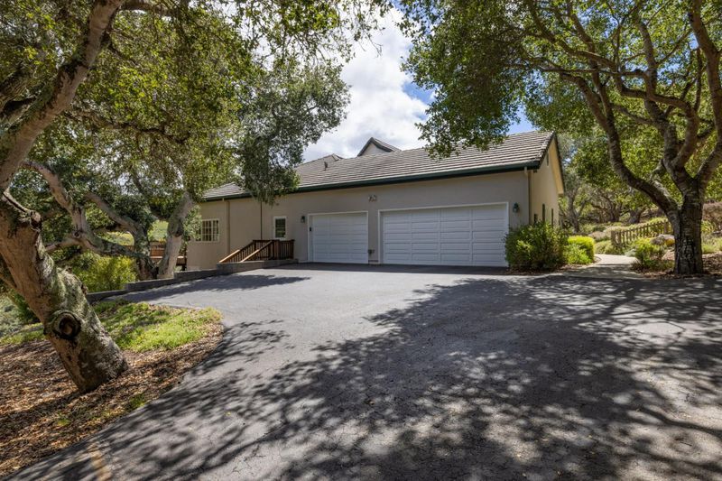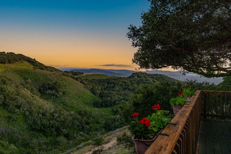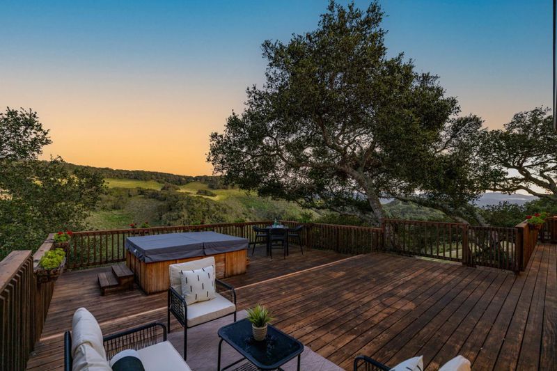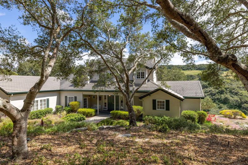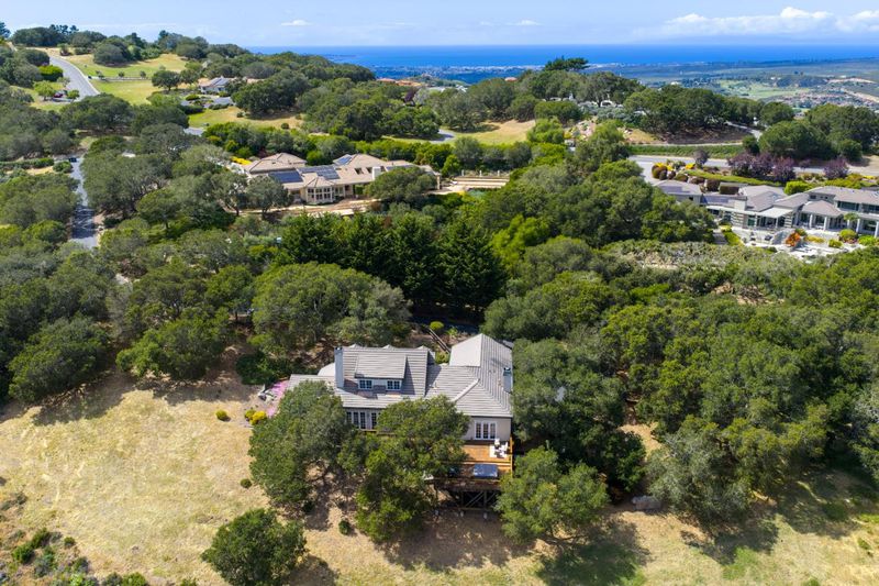 Perched above the Monterey Peninsula in a coveted gated community, this exceptional estate offers breathtaking panoramic views of rolling hills and lush oak-studded canyons. Set in the sunbelt of the Peninsula and on a sprawling private parcel surrounded by mature Oaks, the home blends timeless charm with refined California living. The stately two-story facade welcomes you with a covered front porch, manicured drought-tolerant gardens, and classic green shutters. Inside, rich hardwood floors, soaring ceilings, and abundant natural light set an elegant tone throughout. The gourmet chef's kitchen features a large center island, granite countertops, premium stainless appliances, and custom white cabinetry. The open-concept great room flows seamlessly to the dining area beside a dramatic stone fireplace. The conveniently located main-floor primary suite offers privacy and ease of living. A bright formal living room with a floor-to-ceiling marble fireplace opens through French doors to the expansive rear deck, a true entertainer's paradise. Soak in golden sunsets from the oversized spa, dine al fresco beneath the oaks, or simply take in the sweeping canyon views. This is Monterey living at its finest: private, peaceful, and utterly spectacular.