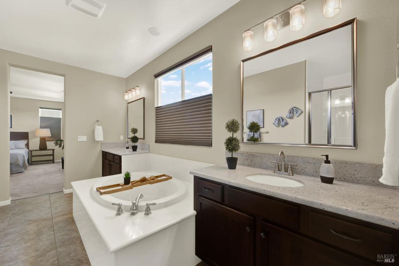 - Double Sinks, Shower Stall(s), Soaking Tub, Walk-In Closet