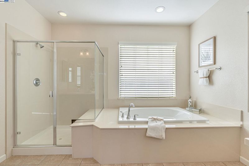 - Solid Surface, Stall Shower, Tub, Updated Baths, Double Vanity, Window